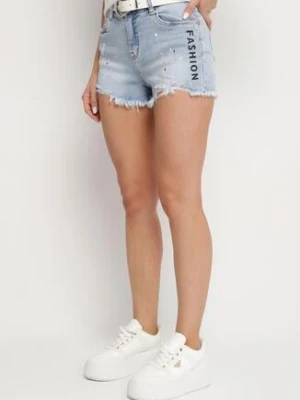 Jasnoniebieskie Szorty Jeansowe z Wysokim Stanem Zdobione Przetarciami i Cyrkoniami Galinora hello miss