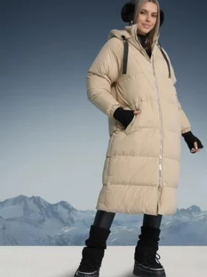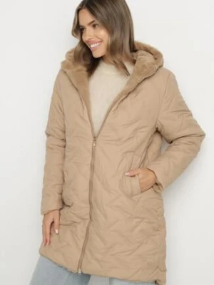 Ciemnobeżowa Długa Kurtka Dwustronna z Pikowanymi Przeszyciami i Kapturem Olidia j.style