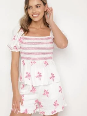 Biało-Fuksjowa Bawełniana Bluzka Typu Hiszpanka z Ozdobnymi Haftami Merafina rosa