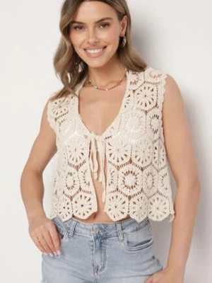Beżowa Szydełkowa Kamizelka z Bawełny z Wiązaniem Folicea rosa