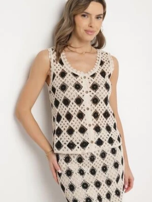 Czarno-Beżowa Kamizelka Szydełkowa z Dekoltem w Serek Banisella rosa