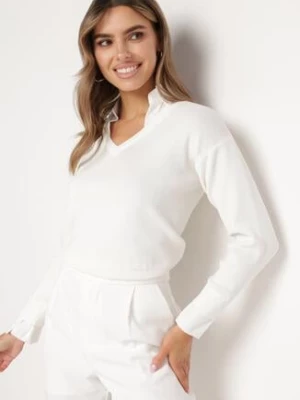 Biały Sweter z Koszulową Wstawką i Dekoltem w Serek Terviap rosa