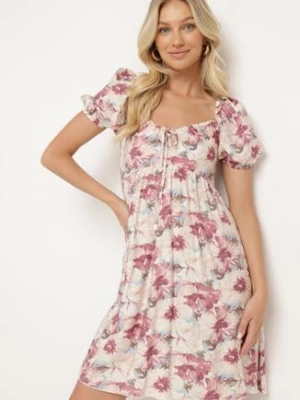 Różowa Sukienka z Bufiastymi Rękawami i Wiązaniem przy Dekolcie z Gumką na Plecach Vikninna rosse line