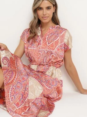 Różowo-Beżowa Rozkloszowana Sukienka ze Ściągaczem w Talii w Stylu Boho Dimirra rosse line