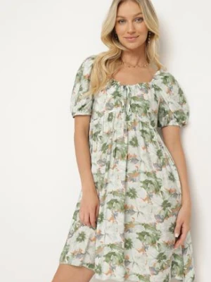 Zielona Sukienka z Bufiastymi Rękawami i Wiązaniem przy Dekolcie z Gumką na Plecach Vikninna rosse line