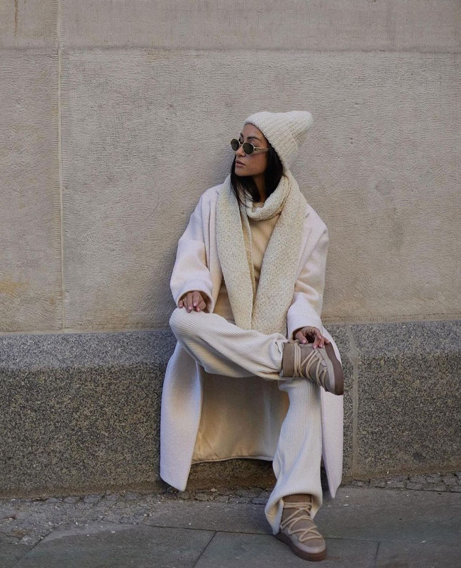 Wśród najbardziej pożądanych zestawień króluje duet: długi wełniany płaszcz o luźnym kroju i klasyczne Inuikii Curly Rock w kolorze ecru. To stylizacja, która wygląda jak z ulic Kopenhagi - dopracowana, ale nieprzeładowana, zbudowana wokół naturalnych tkanin i neutralnej palety. Do tego wystarczy dodać dzianinowy golf, kaszmirową czapkę i torbę w typie tote bag, aby stworzyć look, który bez problemu mógłby znaleźć się na łamach Vogue Scandinavia.