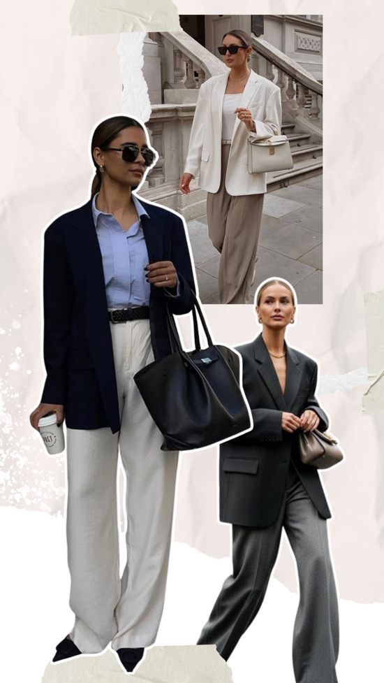 Najbardziej oczywiste, a jednocześnie najbardziej efektowne połączenie to komplet z marynarką. Garnitur damski w wersji oversize, z szerokimi spodniami z zakładkami, tworzy sylwetkę silną, ale nieprzerysowaną. Wystarczy prosty top lub dopasowane body, aby zachować równowagę między objętością góry i dołu.
